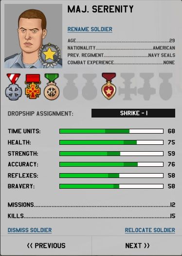 Major Serenity was killed in action 23 March 1980. He and three other operatives were clearing the command deck of a downed alien cruiser. While engaged in a ferocious close quarters firefight with three androns that were firing explosive ammunition, Major Serenity was struck down. He died Immediately. Major Serenity was an irreplaceable asset to the Xenonauts organization and his contribution will not be forgotten. He was a decorated veteran of twelve missions including the Edinburgh and Cape Town missions. In his time of service with this organization he was awarded The Service Medal for active participation in ten missions, the Order of Merit for the elimination of ten extraterrestrials in combat, the Citation for Courage for his actions at Edinburgh, and the Crimson Heart for being seriously wounded in service of humanity.