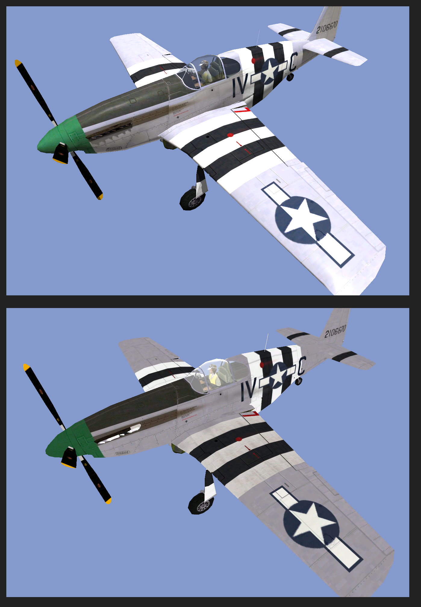 I just whipped up a case study. I added some white stripes to the wings of a 109G-6 scheme that already had white parts. All white areas on other part of the main scheme are darkened with 15% black. The stripes are a combination of a 100% white portion next to a darkened portion, 15% black on the left wing and 20% on the right. The stripes have the same specularity as the camo paint to really illustrate how the white reacts.