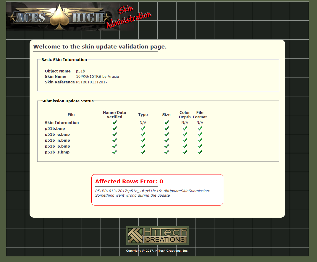 The system should not have allowed you to submit an update to a skin already in the update queue.  Unless you used the browser back button and hit it there.  All bets are off in that case, but it would account for the error as that is the other place I can catch someone trying to update a skin which has already been submitted as an update.