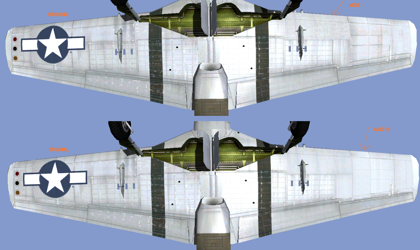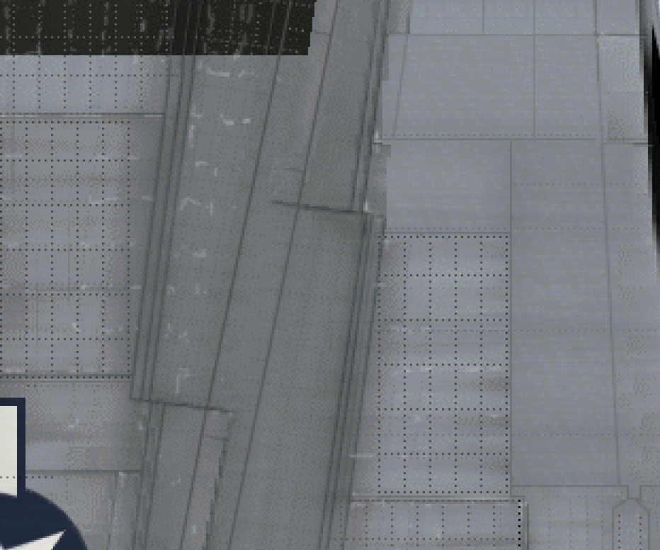 The diffuse map.    The lower wing of an adopted P-51.    I've noticed that the way Mus did it you have depth of field at the expense of pixelation.  I want to know if there is a way to reduce pixelation in panel variation without losing depth.    Every method I have tried from simple gaussian blur on up has not really helped.