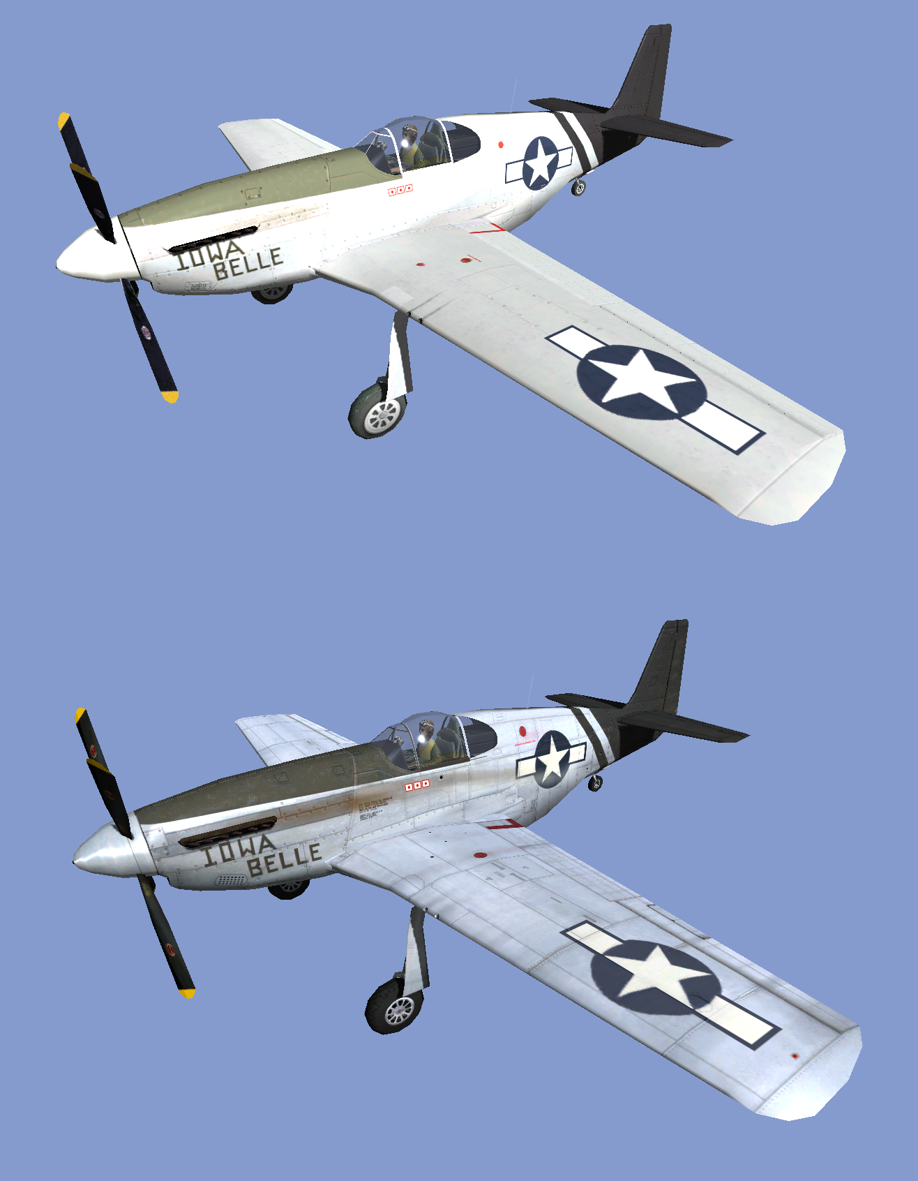This airplane was originally skinned by Player1.  It was adopted and updated for Aces High 3.  I preserved as much of his nose art and tail paint (both with modifications for accuracy) as I could.   Unfortunately for the nose art it was too small so I wound up doing a lot of cutting and pasting to expand it rather than redraw it completely--which would have been faster, but as always, I try to salvage something from the original if I can.   The A was wrong so I was forced to redraw that entirely.