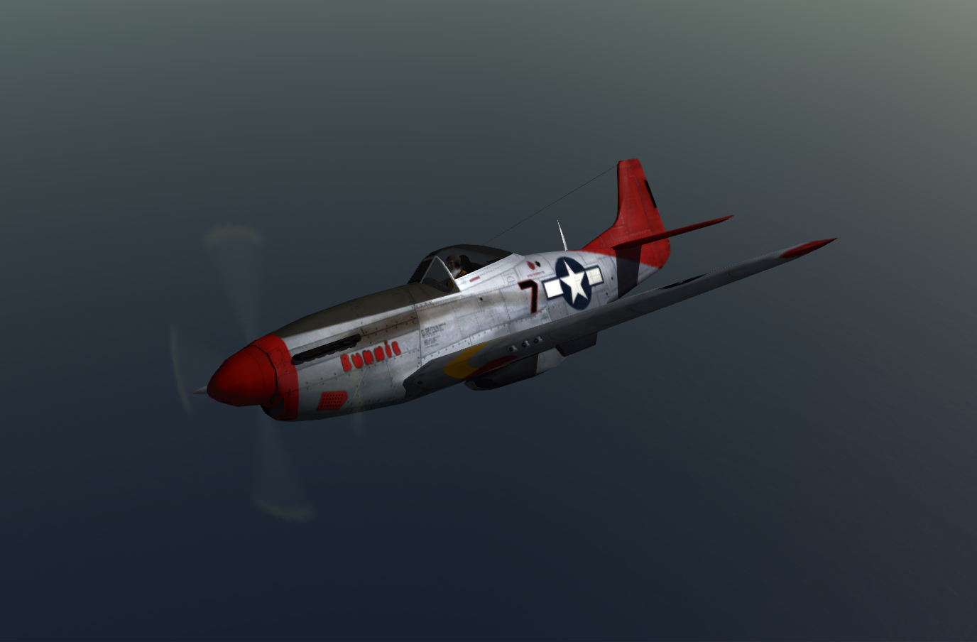 I can always desaturate the colors, but these seem to work best in a variety of conditions.  I can adjust them as necessary of course.   Sadly, the only color photo I have is very faded.   These are updated colors as the original skin's were inaccurate.   The original skin also did not have nose art on either side, had the nose cowling paint wrong, and did not have the red borders around the No. 7 side number nor the aft fuselage three digit code.