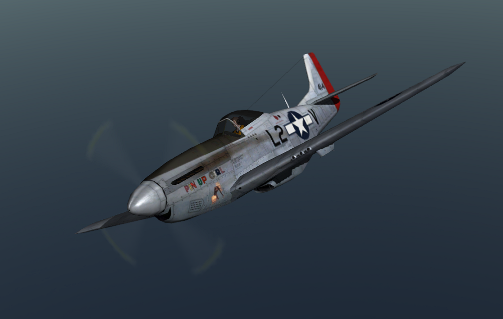 This skin was originally created by MachNix. I preserved his radiator scoop (slightly modified) and some nose art lettering as a hat tip to his work, though I had to change the colors on some letters to reflect those of the actual aircraft. The game compresses it, hence the slightly pixelated look to it. I don't know how to work around that other than making the letters larger (inaccurate) The female figure is taken from a close-up color photo and is thus Sgt. Heyer's "original work" in a sense.