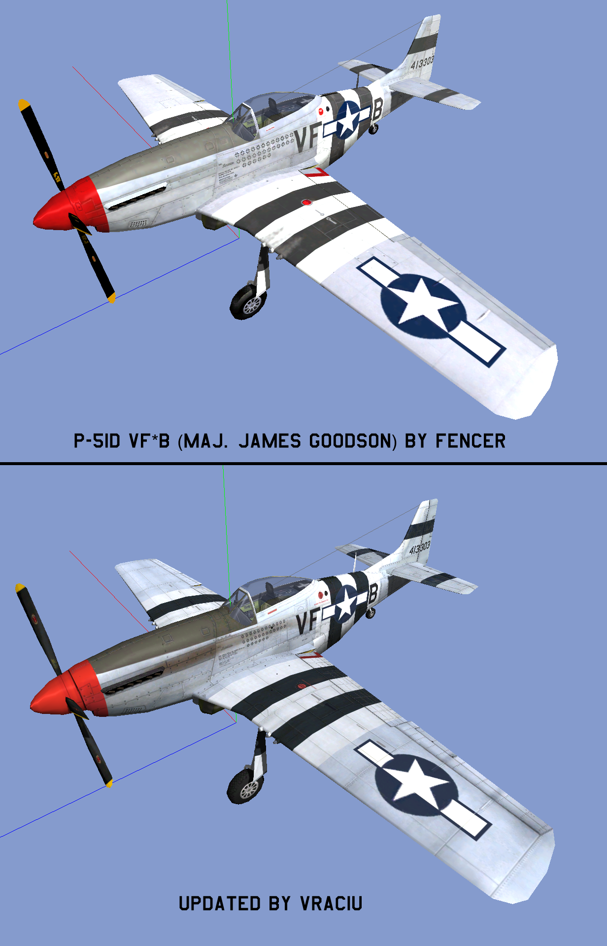 This skin was originally created by Fencer. I initially intended to simply straighten out the Invasion Stripes and move on, but I decided I could tweak it a bit further and wound up redrawing the entire thing. I retained Fencer's stenciling with Maj. Goodson's name on the left side of the fuselage as a tribute to the original skinner.