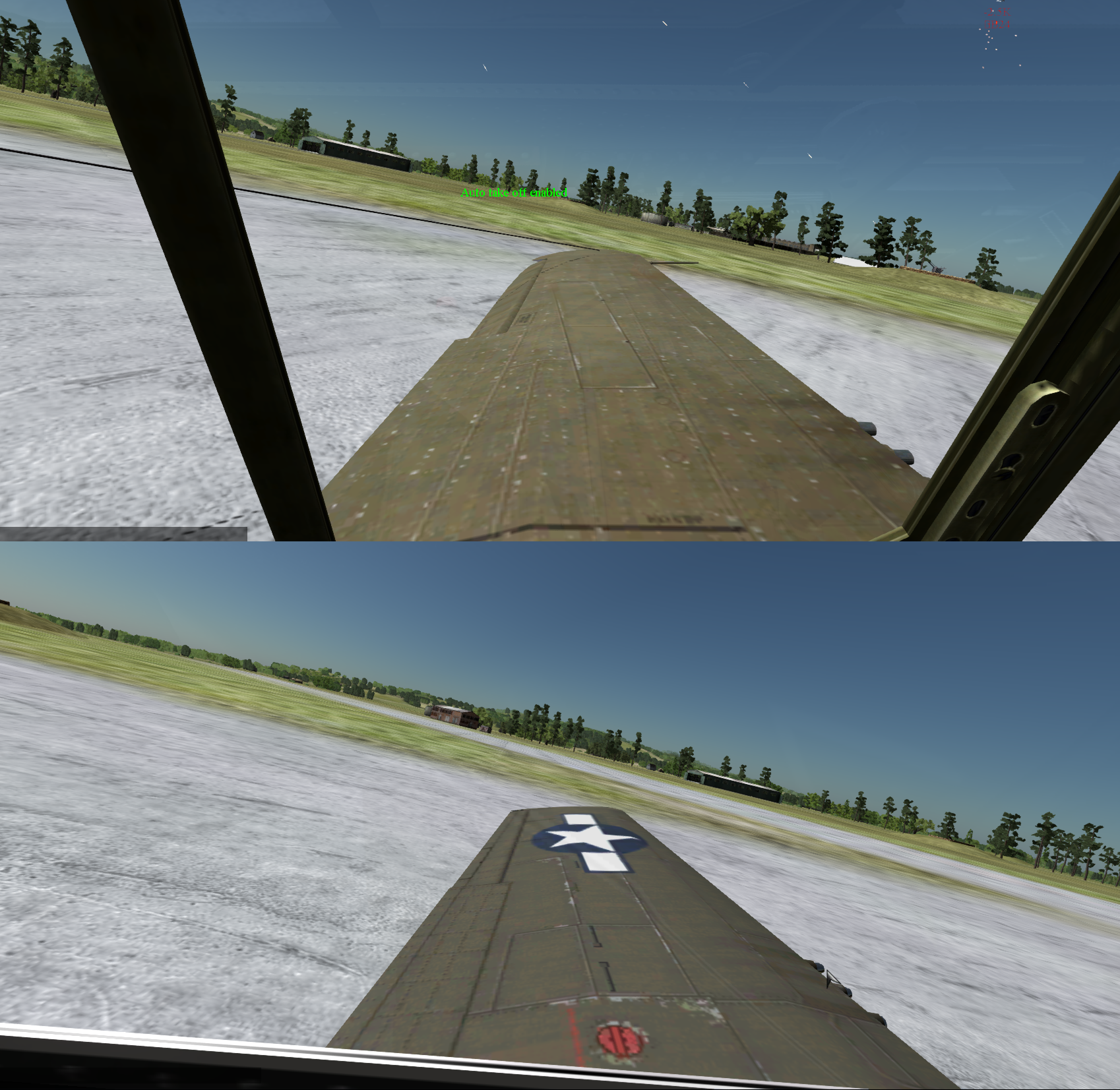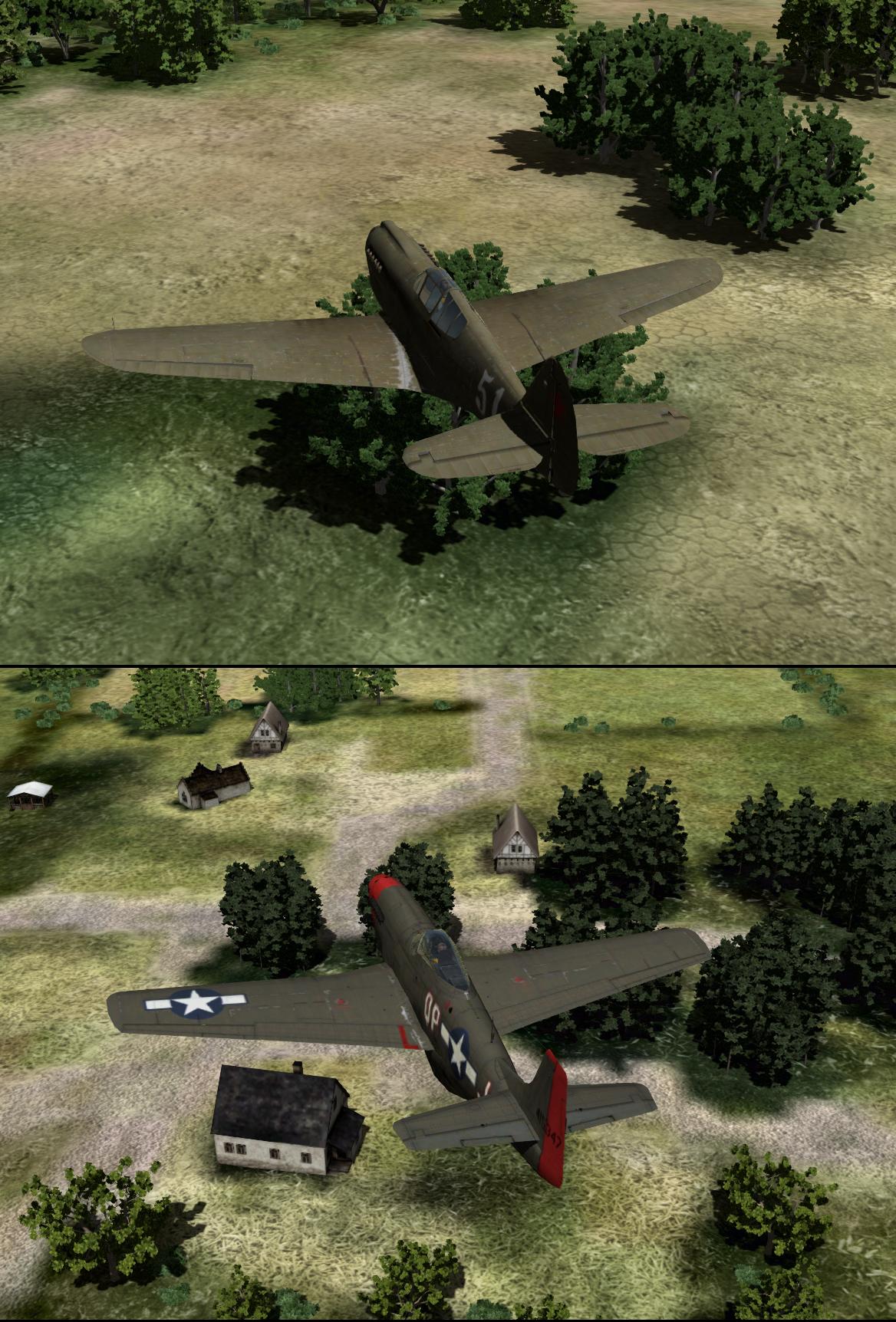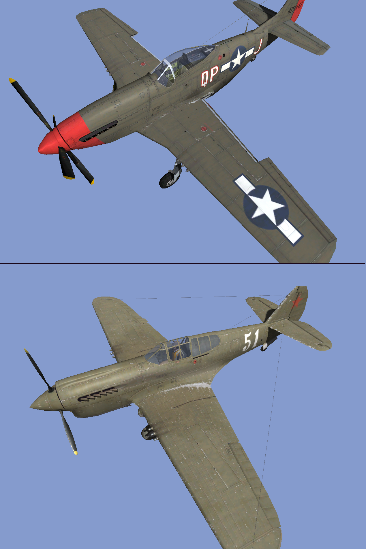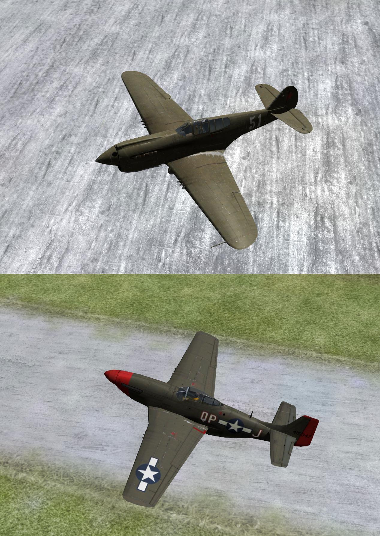 So, in a vain and likely fruitless attempt to figure out why I am seeing what I'm seeing I decided to do a screenshot comparison between a Mustang I'm working on (I've turned off some of my layers in order to focus on the color itself) and one of Devil's excellent P-40s.   I'll try this comparison with one of Greebo's Jugs later if this doesn't help me solve the riddle.