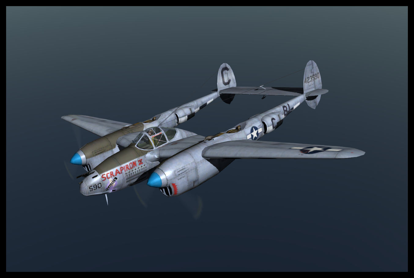 This P-38J-25-LO (S/N 44-23590) was flown by Capt. Laurence E. "Scrappy" Blumer of the 367th FG, 393rd FS in 1944.  Named "SCRAPIRON IV" it was in this aircraft that Blumer downed five FW-190s in the span of 15 minutes.