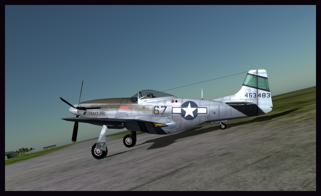 This is Maj. Robert "Todd" Moore's P-51D-20-NA (s/n 44-3483) named "Stinger VII" and coded number 67 of the 15th Fighter Group's 45th Fighter Squadron on Iwo Jima.  Moore was the leading Very-Long Range (VLR) Mustang ace of the war with eleven of his twelve kills achieved on these missions.   Orginally flown by Major Gilmer "Buck" Snipes, who not only scored the 45th's first victory (an H8K "Emily" flying boat in a P-40N on 23 October 1943) but also scored a victory on the first VLR mission in this aircraft, which was named "TOM KAT" at the time.   Moore renamed it "Stinger VII" after assignment to the aircraft following Snipes' rotation back to the United States.   It is depicted as it would have appeared following his 10th victory on 7 June 1945.   Notably, the large diagonal squadron markings would soon give way to a simpler version where only the tips of each surface were painted.