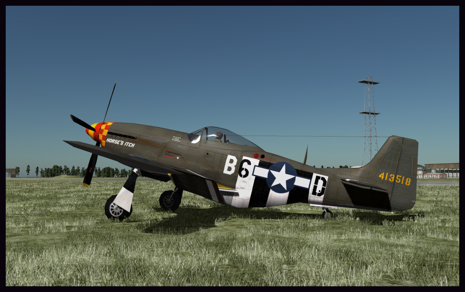 This is Major Edwin W. Hiro's P-51D-5-NA, "Horse's Itch" (S/N 44-13518, coded B6*D). Hiro was commander of the 363rd Fighter Squadron, 357th Fighter Group based in Leiston, Suffolk from June to September 1944. An ace with five victories, Maj. Hiro was killed in action on his final scheduled combat mission in a massive air battle against German Me-109s while providing air cover during Operation Market Garden.
