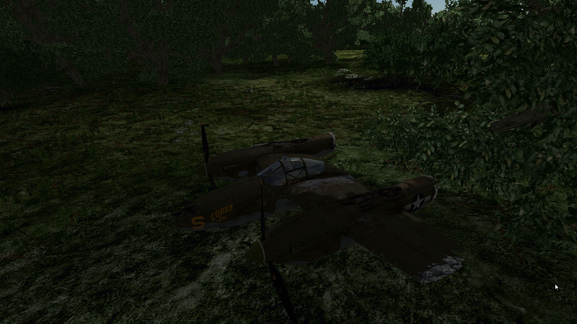 I even landed on occasion.  This shows that I've not lost my touch, despite the long time away from the game.  I parked my bird in the shade of the trees nicely. Other flights ended single engine trailing smoke, rudderless and belly landing.  I have resumed distributing 38G parts like the olden days :)